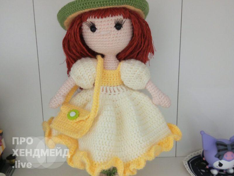 Hand knitted doll from hypoallergenic cotton threads. All clothes: dress, panties, shoes, hat, bag are removable. The height of the doll is 25 cm. Can be used for interior decoration. It will also be a beautiful and unique gift for a girl.